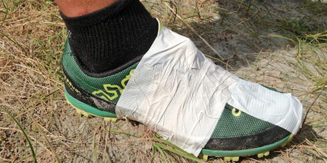 Men tejpa över dubbningen? Jepp, inga problem. Efter första klippan har dubbarna träng igenom och efter 90 minuters swimrunträning ser sulan ut som ovan. Inga bekymmer alltså. Bara tejpa och kör!