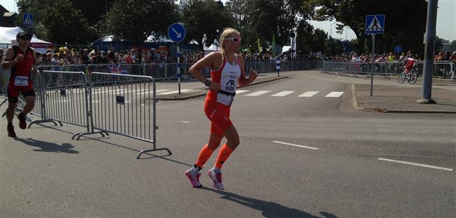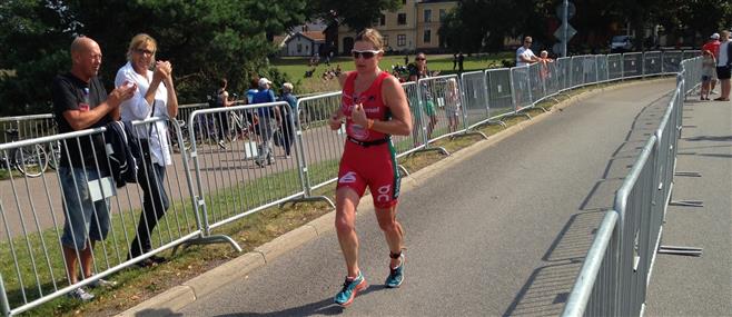 Här kommer Eva Nyström in mot varvning, hon har cyklat starkt och är även en mycket duktig löpare.