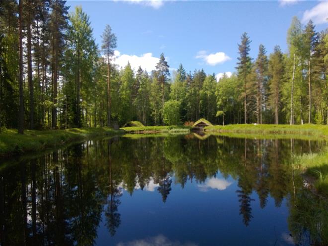 "Min favoritrunda på 16km. Hade med mobilen och lyssnade på musik när jag sprang, underbart sätt att uppleva naturen på. Stannade vid en tjärn där en lite koja ligger och tog denna bilden"