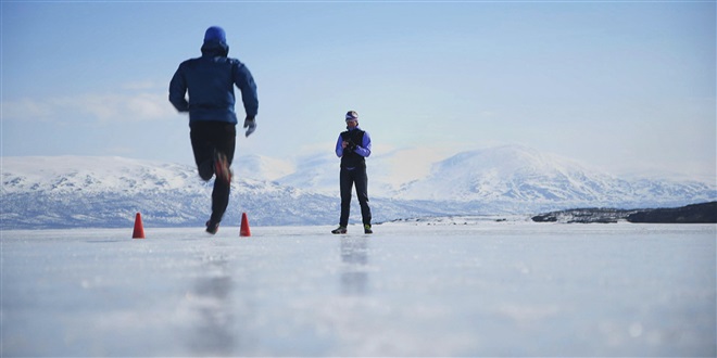 Du får se dem sätta broddarna på prov genom att testa passform, slitage och fäste på is och snö. För att testa greppet springer Andreas och Eva två halkbanor, en på is med tvära kurvor, och en backig bana med både lös och hård snö.