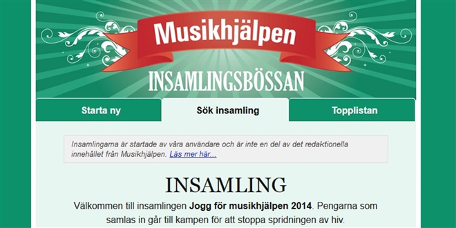 "Jag har startat ett initiativ för att skänka pengar till Musikhjälpen 2014. Såg i skrivande stund att det finns startade insamlingar på Jogg, men att jobba på bred front tror jag är bättre än att inte ha någon front alls! Jag bifogar mitt foruminlägg som ligger till grund för min tanke till insamlingen".
