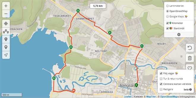 Om något blir knas när du ritar en runda så kan du alltid ångra de senaste klicken. Kommer du på att en sträcka mitt i rundan är fel eller om du kanske behöver förlänga/korta av rundan så kan du även redigera enskilda punkter. Klicka på kugghjulet längst ner till höger och kryssa i Redigera så blir alla punkter flyttbara. Vi har lite problem med Redigera i kombination med Följ vägar så ha överseende med om funktionen inte alltid beter sig som förväntat och spara ofta.