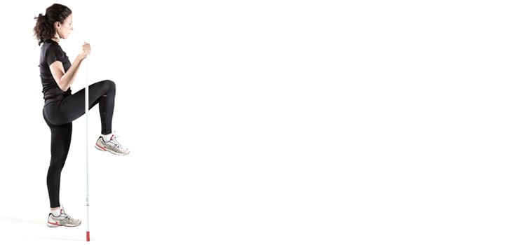 Håll dig i något och lyft ena benet över 90 grader i höften så att höftböjaren används.