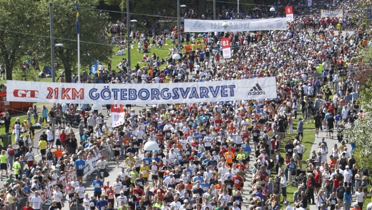 Över 75.000 löpare hade anmält sig till årets upplaga av GöteborgsVarvet. Det innebar 30 startgrupper som skulle slussas iväg i en jämn takt. Under några timmar snackar vi en två mil lång orm av löpare runt och igenom Göteborg. Nåt som måste se lika mäktigt ut från luften som för oss på banan.