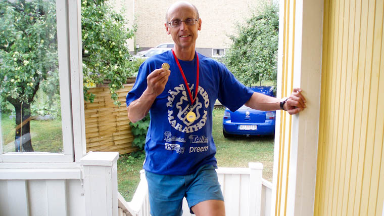 Jag provade att börja springa, men redan efter 200-300 meter flåsade och stånkade jag som en flodhäst. Jag kände mig så tung och skulle ha behövt svalkat mig i vatten precis som en flodhäst. Det gick bara inte att springa eller ens jogga mer än hundratalet meter. Så fort som jag började försöka springa gick pulsen upp och jag började andas tungt. Till slut kom jag in i mål gående med fruktansvärda kramper i benen på 04:41:30 vilket gav plats 38. Det blev den jobbigaste och hemskaste maran som jag varit med om.