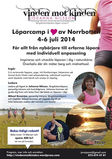 Boka in sommarens löparläger beläget uppe i Överkalix vid polcirkeln. Under tre dagar får du springa i vackra trailmiljöer, träffa andra löparintresserade, ta del av midnattssolen, simma som återhämtning, lyssna på föreläsningar, avnjuta näringsrika måltider och ha chansen att vinna både massage och löparcoaching. Till din hjälp har du två personliga tränare med löpning som specialitet som kommer plocka fram löparen i dig. Läs mer på