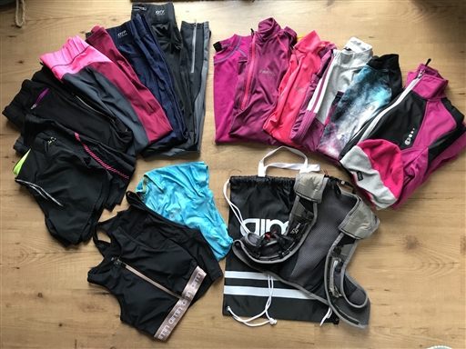 Here we go again! 4 tights, 1 splitshorts, 1 korta tights, 1 underställströja, 4 funktionströjor, 1 jacka, 1 sportBH (oanvänd), 2 toppar, 1 gynnat, 1 rygga (utan blåsa). Vissa av grejerna är knappt använda, andra välanvända men synd att slänga/har mer att ge. Allt är XS-M.