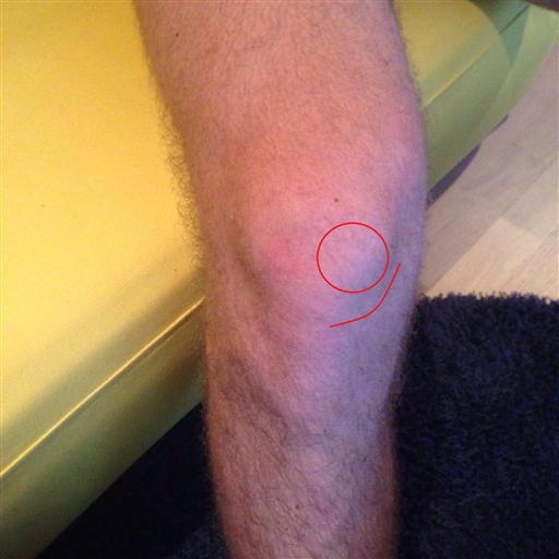 Bifogar bild för förklaring (@Stefan). Om jag trycker runt på knät känner jag tydlig smärta nästan på och mot insidan av knät (inringad cirkel). Vid löpning (när jag lägger hela vikten på ett ben vid löpsteg, framförallt i nedförsbacke) känns som en knivliknande känsla insida/under knäskål (inritat streck).