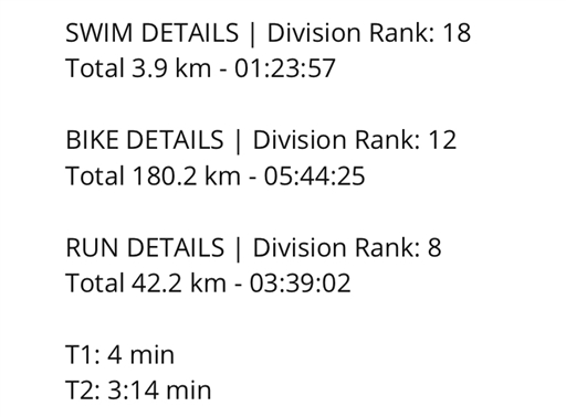 Körde sedan en halv IM 2014 i Sala, på precis under 5 timmar. Efter det loppet anmälde jag mig till Kalmar 2015. Körde även långdistans triathlon (4000m sim, 12 km cykel, 3 mil löp) i juni 2015. Som lite uppvärmning inför Kalmar :)