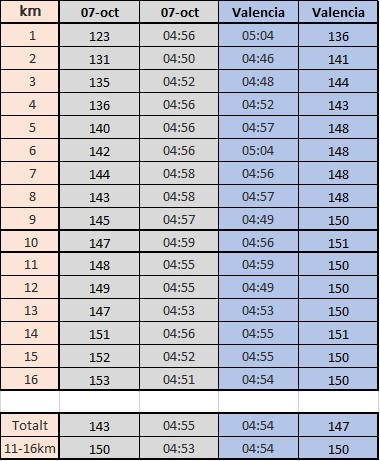 I torsdags : Körde 40 minuter på bana. Hade lite svårt att tro på min klocka (Garmin FR235) som angav 4'30/km och i bland ner till 4'20. Pulsen var dock rätt normal för mitt maraton tempo (typ 4'55) som jag initialt ville köra. Vid en tidig koll så gick det bara hårfint snabbare än 2 minuter på 400m så tempot verkade vara i linje, så jag fortsatte att hålla min förväntade puls-stigring & det initiala tempot på klockan. När jag sedan kört 22 varv och tittade på tiden så hade jag snittat 4'36/km, men pulsen var förhållandevis låg. 153 på 9e kilometern låg jag nästan i linje med min puls från 9e kilometern i Valencia maraton i fjol. Knät gjorde sig hörd under 2 km typ mellan 4e och 6e innan känslan försvann. Gott så.