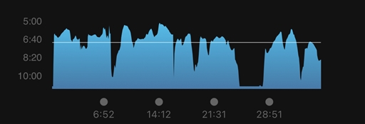 Bifogad bild är ett praktexempel. Det är rakt, det är platt, det är jämnt och inte särskilt ansträngande tempo både innan och efter, pulsen ligger helt normalt och så plötsligt en dipp från ca 5.10-fart ner mot sjuminuterstempo under 3-400 meter. Mäter jag sträckan på karta är den exakt lika lång som klockan plottade den till.
