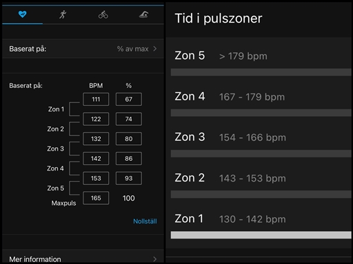 I klockan, och *endast* i klockan (?), finns inställningen för automatisk detektion av uppmätt maxpuls? Nån gång när jag loggat utan pulsbandet och bara med den optiska, så hade 191 bpm blivit toppnotering, och troligen det som då styrde zonindelningarna för *utvärdering* av passet.