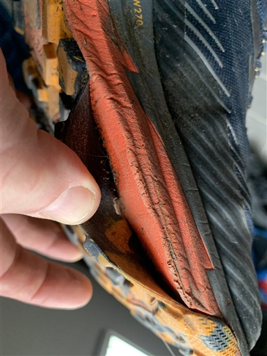 Kommer reklamera mina nästan nya Torrent 2. Efter bara tio mil löpning (och visserligen ett gäng hundpromenader också) håller i princip hela yttersulan att släppa, både bak i hälen och framme i sidan, se bilden. Mina förra Torrent höll i alla fall i 70 mil.