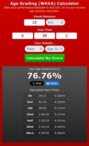 Jag har använt WMA Age-grading calculator länge nu, men med faktorer från 2006/2010. Det statistiska underlag ändras ju hela tiden så man får lite olika %-satser om man använder den eller den som länkas i denna tråd. Men skillnaden är ganska marginell.
