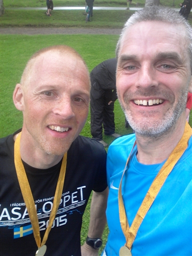 Jag försökte slappna av i löpningen när jag kom ut på fast underlag. Jag hade ingen fartkänsla alls utan försökte bara slappna av. Jag blev både förvånad och orolig när första kilometern gick på 3:33. Kricke kom ikapp mig vid ca: 2 km, jag tänkte ta lite rygg men hade inte en chans. På Svenskholmen började jag bli ordentligt trött men lyckades ändå hålla ganska bra fart. Tankarna på att ge upp som jag vanligtvis brukar få på sådana här plågsamma lopp kom dock aldrig :-). Calle kom ikapp och flåsade mig i nacken i den tuffa backen med bara några hundra meter kvar. Jag lyckades dock precis hålla undan hela vägen in i mål. Det blev en ordentlig putsning av mitt PB och jag är minst lika nöjd som överraskad. Jag var så exalterad och nöjd att jag t.om. glömde stänga av klockan när jag gick i mål :-)