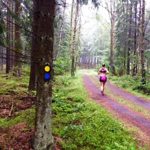 Ett skönt pass tillsammans med frun i regnmättad skog uppe vid Bockeboda. Frun sprang på tunga ben efter det tunga KB-passet i förrgår. Jag tassade med och funderade på om det kommer att överhuvudtaget vara möjligt att jag kan springa den där klassiska 9-milaren i Dalarna om 4 veckor... Hmmm?