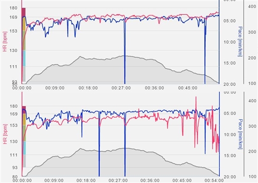 CBMR i Garpenberg. Tredje året nu, en del springer flera varv (upp till 6 varv) medan jag nöjer mig med ett. Banan börjar med 3km Trail uppförs, sedan är det mest skogsbilväg. 2 min sämre tid än i fjol. Men då låg jag på betydligt hårdare. Se bilden som visar fart och puls från i fjol och i år. Lite fel på mätningen i år i slutet.