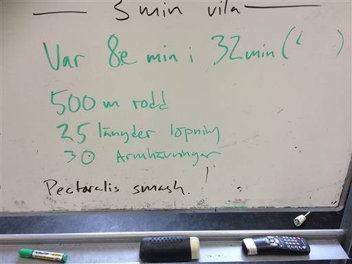 Uppv: rodd + balans WOD: var 8:e minut: 500 mtr rodd, 25 längder löpning, 30 st armhävningar med handlyft, i 32 minuter. Blev c:a 5,20 arbete per 8 min. Mer kondis än styrka idag.