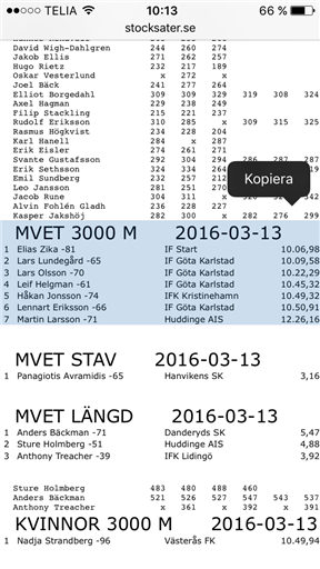 Passerade 1000 m på 3,22 några sekunder efter plan! Försöker hålla fart då jag ofta tappar på framför allt varv 8-12. Passerade halva distansen på 5,04 min fortfarande några sekunder efter min plan. Under varv 9 går kag förbi och försöker att hålla 3,20 som är min målfart! Fick en lucka direkt på några meter. Vid 2000 m hade jag samma tid som vid PB för en månad sen och 6,48 min ( 3,26 ). Försöker att öka på lite men det är nog inte förrän på varv 13 som det gör nån skillnad. Trycker på lite till på varv 14 och nu börjar Lars att ta in. Jag väntar dock till ringning innan jag släpper på helt och håller undan in i mål! Nytt PB 10,06,98 min!!