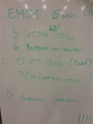 Uppv: rodd + teknik WOD: med start varje minut i 15 minuter: 3 st ground to overhead med skivstång 30 kg + 6 st burpees jumpover. Med start varannan minut i 6 minuter: Farmerswalk 100 mtr med 48 kg. Grymt jobbigt idag, var på gränsen att jag klarade vikten 30 kg, fick slita!