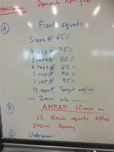 Uppv: Dynamisk stretch mm Styrka: jobba upp till 95% i frontböj, (5 på 65%, 4 på 70%, 3 på 80%, 2 på 85%, 1på 90%, 1 på 95%) och sedan 4 på tyngst möjligt, jobbade mig upp till 60 kg, det är inte styrkan som brister där utan tekniken tyvärr. WOD: 12 min av: 12 st backsquats - 200 mtr löpning. Kom 6 varv, hade 30 kg på stången.