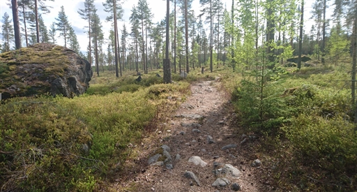 Blandning av elljusspår, skogsbilväg, fin stig och stenig stig. Bilden visar ett ganska fint parti innan man kommer ut på den riktigt steniga stigen.
