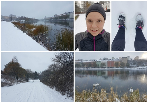 Blir väldigt förvånad över mig själv eftersom jag faktiskt tycker att vinterlöpning en hyfsat fin vinterdag är riktigt trevligt. Jag förknippar annars vinter mest med kyla och längtan att komma in igen... Men det är stor skillnad på att hålla igång och på att stå i lekparken och vänta på att gå hem. Det blir inte farligt kallt ens när man får skorna fulla av snö... Fast det är klart att det nog finns en gräns för när jag tycker det är för kallt, det gör det ju helt klart. Men att springa i snö funkar!