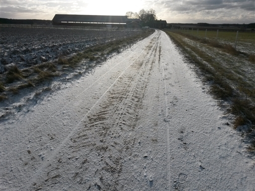 Ca +1 grad. Riktigt bitig motvind på de öppna markerna första milen. Påminde lite om att springa på ett blåsigt fjäll.