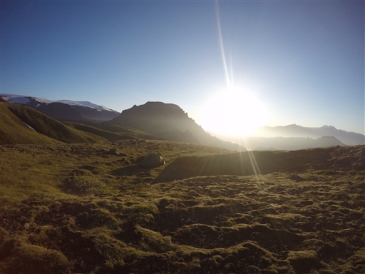 Sol och klarblå himmel hela dagen. Fortsatte genom en bit svartöken. Vidare genom månlandskap som mynnade ut i svensk fjällnatur. Till sist kom vi fram till Thorsmörk som var ett väldans dramtatiskt område med häftiga berg. Tog oss genom sista campingen vid 17 och tryckte på uppåt. Visade sig vara längre och kallare än vad vi trodde så vi vände tillbaka och slog läger längre ner på en fantastisk lite hylla, mitt i bergen.