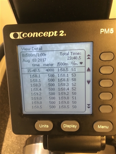 Uppv 10 min, 8x500 mtr med 60 sek vila, snitt: 1,58,5, alla under 2. Nedv 5 min. Kändes helt OK, bra nivå för att vara mig.