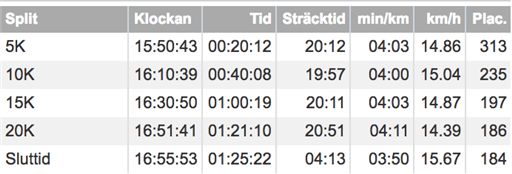 Var otroligt laddad inför det här loppet. Hade ställt in hjärnan på att ligga i 4.00" så länge det gick. Och det gjorde det ungefär till Södermälarstrand där den nya bansträckningen visade sig i form av lite stumma lår. Travade på uppför Tanto och plockade ett par ryggar men kunde inte riktigt hålla tempot. Hade ingen energi kvar till ökning, slutade kolla på klockan vi Slussen, bara att ta sig i mål. 1.25.22 blev den officiella tiden. Pers med en minut känns jäkligt skönt såhär efteråt :) Nu fullt fokus Frankfurt 29 okt!
