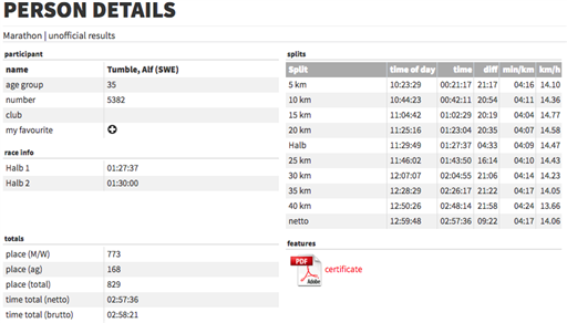 Höll i handbromsen första 10k för att ha krafter kvar. Ökade sedan upp till 20k. Lätta ben. Därefter räknade jag varje kilometer under 4.12" som en liten seger. Kände mig stark. Drack vatten, två gels, kisspaus. Hade en fin och jämn resa fram till 35k då jag började sacka efter. Som tur var fanns det tid att ta av sista kilometrarna. Blev ikappsprungen av 2.59-ballongen vid 41k och fick lite panik. Tog ut mig totalt och spurtade sista biten på röda mattan. Underbar känsla att lägga sig ner på golvet på andra sidan mållinjen. Och ännu bättre blev det när jag insåg att mina vänner Magnus och Björn sprungit på 2.55 och 2.56 – alla klara för NY nästa år!