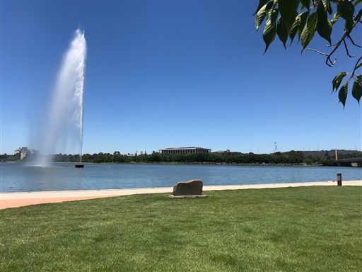 Bilden: Fontänen är en del av Captain James Cook Memorial och är verkligen jättehög (114 meter), svårt att få någon riktig uppfattning av bilden. På andra sidan sjön Högsta Domstolen precis i vänsterkant, Nationalbiblioteket i mitten och en bit åt höger kan man ana parlamentsbyggnadens flaggstång.