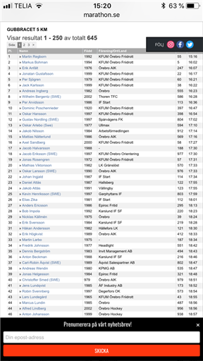 Rusning som vanligt men startrakan är bred så man behöver inte stressa. Hade som plan att gå på ansträngning och försöka att inte fokusera så mycket på tider. Håller runt 3,20 första km men passerar skylten på 3,31 då jag tappar lite uppför bron. Är nu uppe några slag över tröskel och har därmed hittat tävlingsansträngning. Vågar inte gå på max i detta skede och tappar lite på 2-3 km med snitt 3,35. Det ger 10,41 på 3k där jag haft 10,30 senaste 2 åren. Springer solo i princip hela loppet och har svårt att hitta motivationen då det inte finns nån tid eller placering att kriga för. Km 4 på 3,46 men lyckas hitta lite kämparanda till sista km och avslutar med 3,31. Plockar placeringar hela vägen och släpper inte förbi nån bak ifrån. Ville mer men har svårt att vara missnöjd. Gav det jag hade idag och nådde nära maxpuls (194) med 181 / 191. 5 slag högre snitt än i fjol.