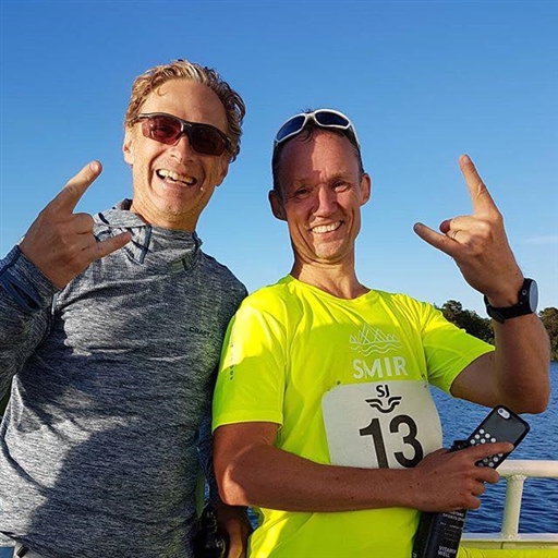 Sista tävlingsetappen och dessutom den ö som skulle vara tuffast. Både längst distans och svårast terräng. Vi hade kollat på kartan och diskuterat med andra på båten och hade en idé om hur vi skulle springa, men tänkte att det nog kunde vara bra att ta rygg på några som var bra på att hitta. Vi hade även laddat med rejält med energi, inklusive Fredriks super-boost och hade också en flaska sportdryck med oss. Stelt att komma igång, men tanken på att det var sista tävlingsön gjorde att det gick lite lättare än på Nämdö. Vi höll oss på den planerade vägen, men efter en stund hade ledet glesats ut och vi var för oss själva. Fredrik hade dock bra koll på kartan så vi visste att vi var på rätt väg. Vi visste att det skulle bli ca en km obanat, men tänkte att det ändå var bättre än att följa vägen som skulle innebära två km längre. Det var nog en missbedömning för det gick mycket långsamt i terrängen. Cut off-tiden hade förlängts från 80 till 90 minuter och det var tur för oss. Riktigt härlig känsla när vi gick i mål.