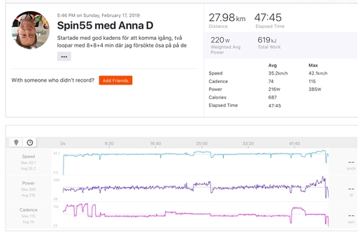 Spin55 med Anna D. Jag o Anneli söndagstränade o Björn var i gymmet. Det gick ganska bra 216 watt vilket är det fjärde tuffaste passet av alla 63 registrerade, i år topp tre: 224-217-216