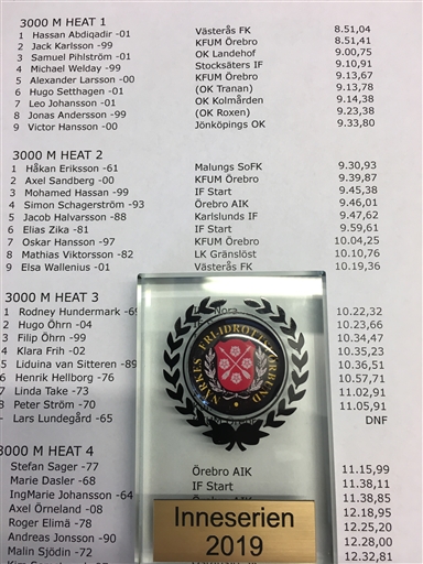 Startar på yttern och kommer väg bra och lägger mig mitt i fältet. 6 pers drar iväg lite direkt och jag drar andraklungan med Elsa Wallenius och Mathias Viktorsson. Första 600@3,15 och det känns bra. På 5´e varvet går Elsa förbi och får en liten lucka. Passerar 1000 på 3,18 med puls 172 / 179. Relativt låg ansträngning. Siktar mot halva distansen och att hålla fart. Tar in på Elsa vilket stärker då jag hört hon siktat på 9,50. 1500 på 4,59,5 och puls 179 / 184. Krigar vidare och kommer upp i rygg och tänker att nu får jag draghjälp. Hör Danne J ropa "GÅ OM" och gör som han säger vilket var tur. Elsa hade tappat snarare än att jag ökat. Har 6,42,5 vid 2000 och är efter planen med 180 / 182. Mathias går om och jag tar rygg. Försöker att hålla fart varv 11-12 med fokus på mitt eget lopp för att börja öka med 3 varv kvar. På varv 13 går jag förbi Mathias och försöker öka. Får en liten lucka som sakta växer. Ökar ytterligare på näst sista. Vid ringning ser jag klockan visa 9,25 och tänker att SUB 10 kan gå men då måste jag ge allt. Går om Oskar Hansson som kroknat. Mjölksyran flödar men får upp farten. Stannar klockan på 10,59,10 och hoppet om officiell SUB 10 lever. När resultaten kommer upp är det officiellt 9,59,61!