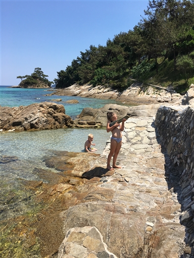 Söder om vår strand Makryammos ligger en liten ö. Elvira o Julian brukar gå/klättra dit och leta snäckor. När det var dags för att gå till rummet för att göra oss i ordning för middag simmade jag dit för att säga till. Är ingen simmare men lite extra träning är aldrig fel. Simmade sedan tillbaka igen.