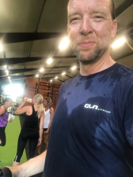 3 x 10 min. Den ena körde övningar med den andra rodde. SJUUUKT varmt i lokalen. Och galet jobbigt. Men kul som fasen.