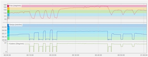 Hade bestämt innan att köra på 13.5 km/h som ger 22:13 på 5k. Kände efter i början men vågade inte kolla på pulsen. Fast efter halva insåg jag att detta ska jag klara av. Visst blev det lite jobbigt sista två km men inte så att jag funderade på att kliva av eller sänka farten. Funderade istället lite på att höja farten lite sista km men beslöt att fortsätta i samma fart. Hade nog orkat några km till men knappast i 10km totalt. Och när jag i efterhand kollade pulskurvan så ligger den onekligen ganska högt.