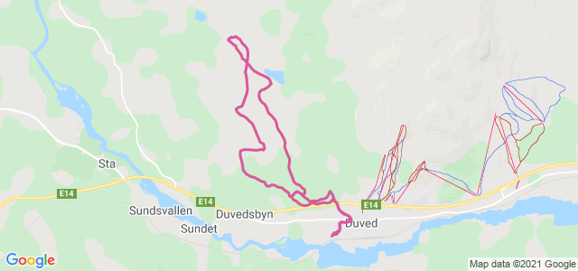 Duved mest i fina spår men längst bort en runda i obanat, ca 5 dm djupsnö. -12° som bet i kinden. Dåligt fäste i spåret i kallsnön.