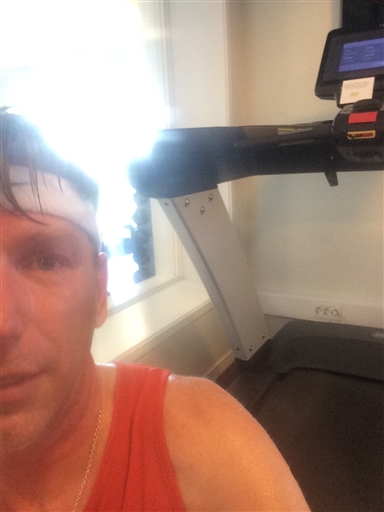 Uppv 15 min Intervaller: 2x10 min @ 4:15/km, 2x5 min @ 4:10/km, vila: 3 min jogg. Nedjogg: 4 min. 1,5% lutning hela passet. Ingen ide att ta fajten med nordvästanvinden idag så det fick bli inomhus. Kändes ganska OK, lite trött på sista intervallen men inga problem att hålla farten.