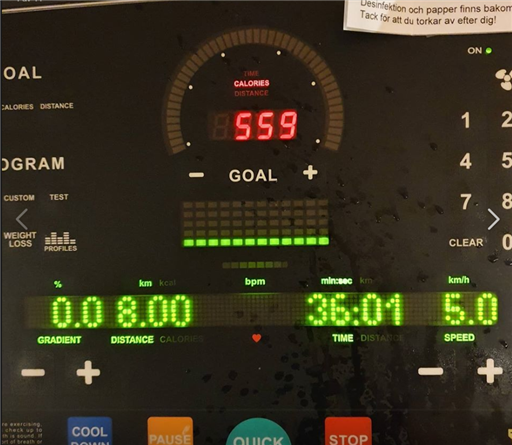 Efter några lugnare dagar var det dags att köra lite hårdare igen. Till gymmet utan definitiv plan. Ville känna av läget lite först. Nja, inga studsande ben så det blir nog intervaller. Satte farten på 13.4 som är cirka 4:30 min/km. Benen var lite småsega så jag tänkte köra 2-3km eller 15 min. Fast vid 15 så ökade jag målet till 5km. Vid 5 tänkte jag att jag körde ju 6km för 2v sedan så nu får jag väl köra 7 då. Efter 7 kommer 8. Då klev jag av. Det var ju ändå inte min perfekta dag idag.