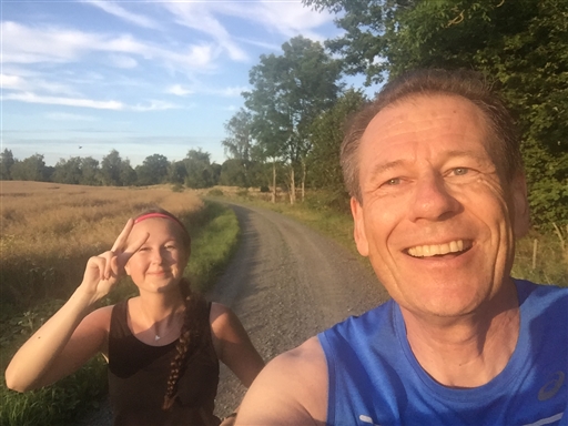 Springer i lugnaste tempot till ”bommen” o tillbaka, tre pauser, dopp vid Balsby badplats direkt efter, finfint väder