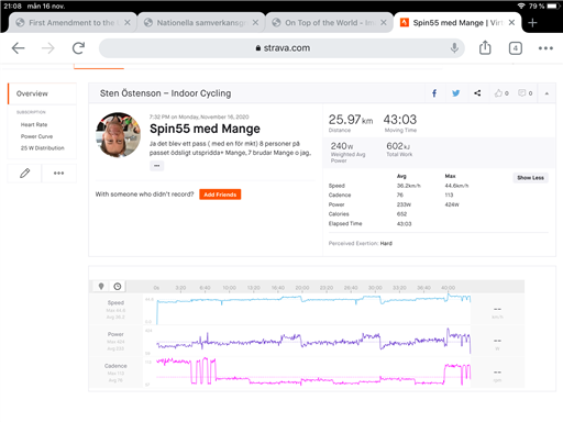 Silver! Näst tyngsta medelbelastning på spinningpass i år 233 watt jag räknar inte de i och för sig tunga passen på ”fejkcykeln” Nr10 cykeln ger +25-40 watt o där har jag ett på 265 o ett på 250 watt men på cykel20 som idag o de andra är årets bästa pass 235-233-229-228-226-226-224-222-222-220