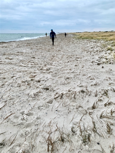 Från Gästgifveriet i Skanör via stranden, förbi hundratals badhytter, längs Öresund ner till Falsterbo fyr. Tillbaka till Gästis längs golfbanor och miljonärskåkar. Rejält blåsigt.