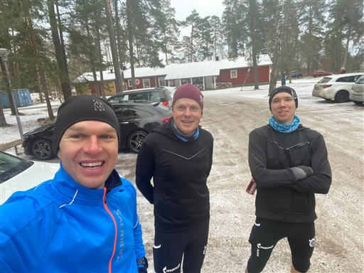 Underbart långpass med ÖAIK i fint vinterlöparväder. -1 grad, 2-3 m/sek vind och uppehåll. Oväntat bra känsla i kroppen med låg och stabil puls. Gick lite fortare än tänkt men valde åtminstone att medvetet att hålla långpasset kort. Fin fint sällskap av många olika löpare under passet som avslutades med gubbarna på bilden!