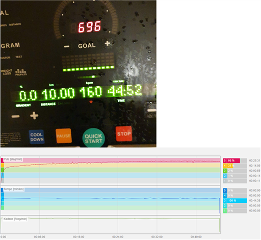 Idag var det dags igen. Ett försök på bandet och sub 45. Visste att formen är god men lite orolig över lite hög puls under uppvärmningen. Men det kanske var nervositet? Pulsen gick upp lite för högt lite för tidigt men jag klarade ju att att springa ändå så det vara bara att gneta på. 30 min på rött är inte direkt behagligt.