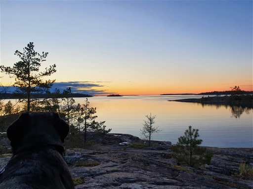 Finrunda på varierat underlag med vovven. Vacker kväll så många fotostopp. Ålands hav låg blankt. Kändes som förväntat lite segt efter en tids frånvaro från löpningen. Sugen på att komma igång igen.