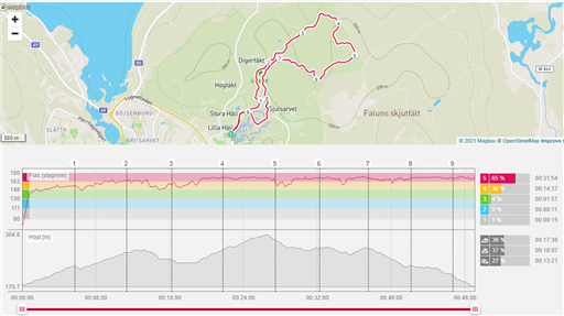 Slog förra årets tid ganska rejält, i fjol 50:37. Men jag var tröttare i år. Många minuter i röd zon. Lite kvavt var det och åskan hördes på håll.